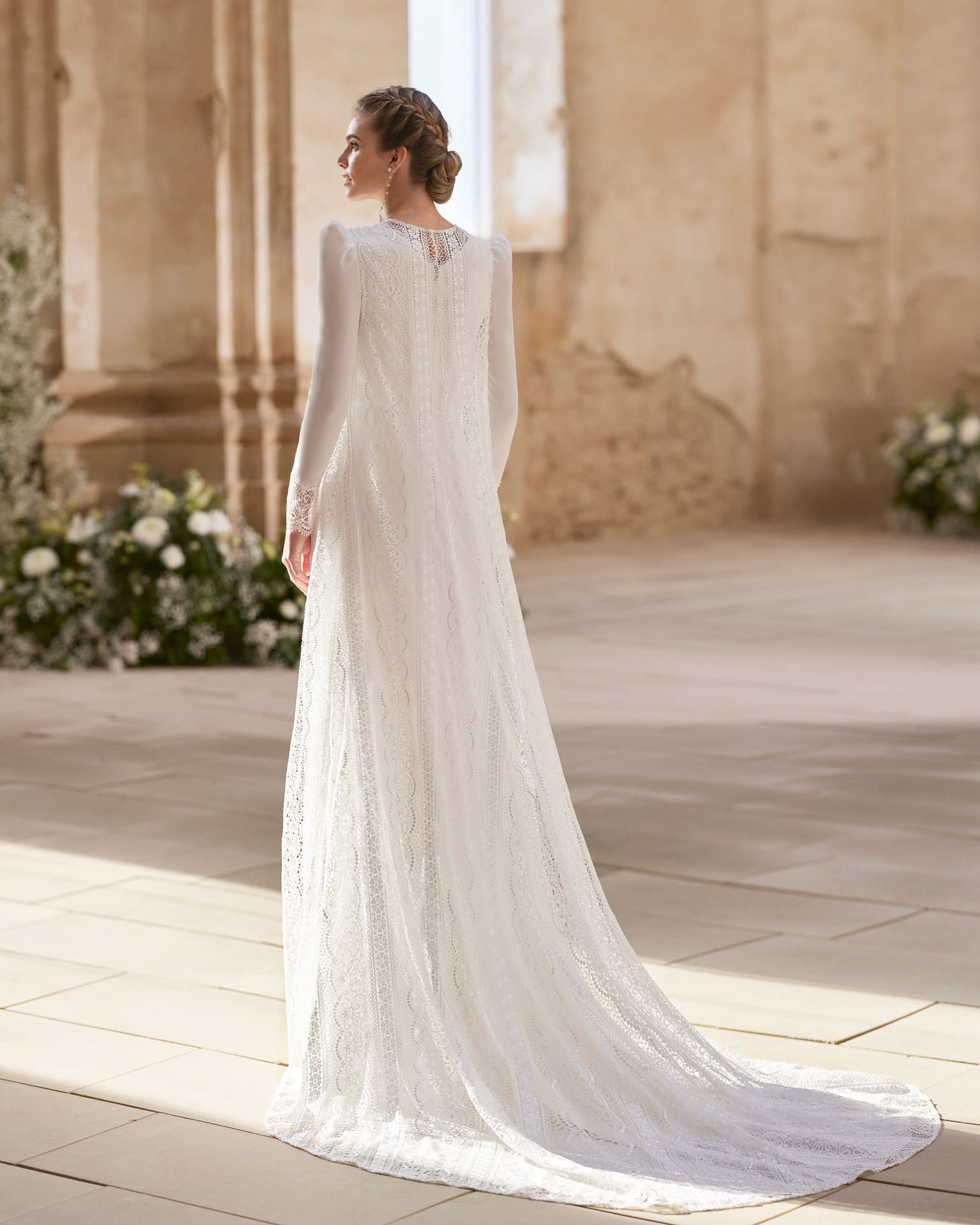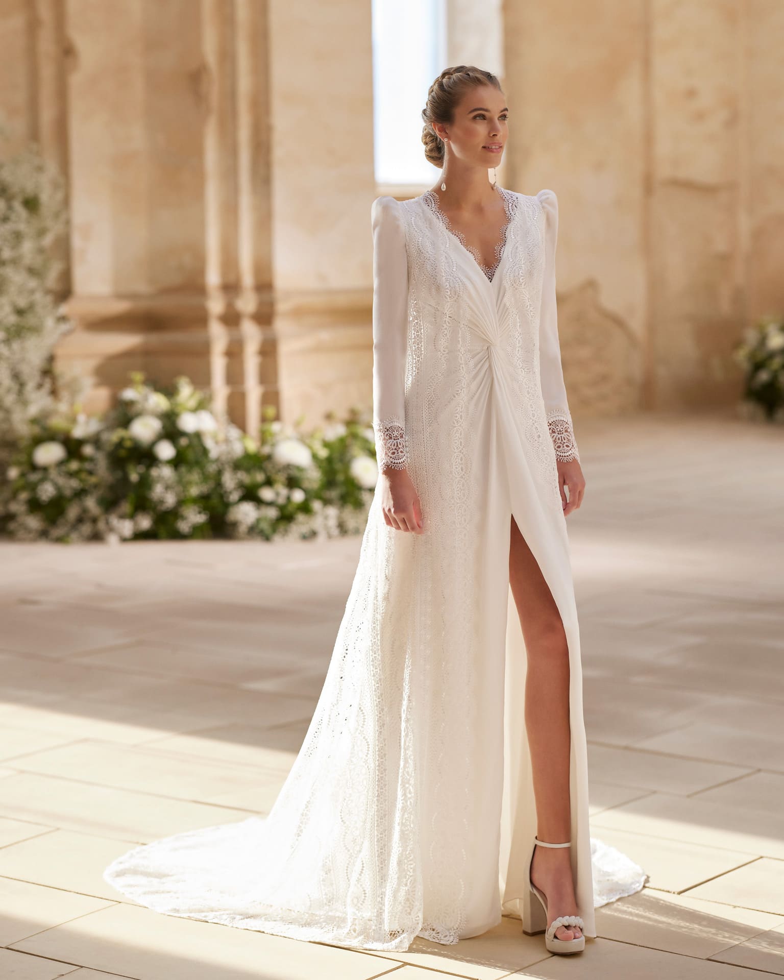 El vestido de novia HAZIEL de Alma Novia es la perfecta combinación de elegancia y fluidez. Confeccionado con delicados detalles de puntilla en el escote en V y los puños, este diseño destaca por su espalda cerrada y mangas largas, ofreciendo sofisticación absoluta. Su falda en línea A con apertura delantera añade movimiento y un toque seductor. Una elección ideal para novias que buscan romanticismo con un aire moderno.