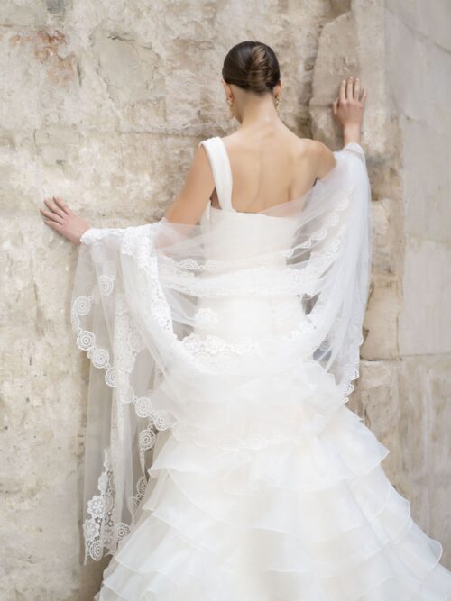 Vestido de organza de seda en blanco roto, con drapeado en el cuerpo, un solo tirante opcional y volantes pequeños desde la cadera, que le dan un carácter muy especial al vestido de novia , haciéndolo combinable con cualquier tipo de velo o mantilla.