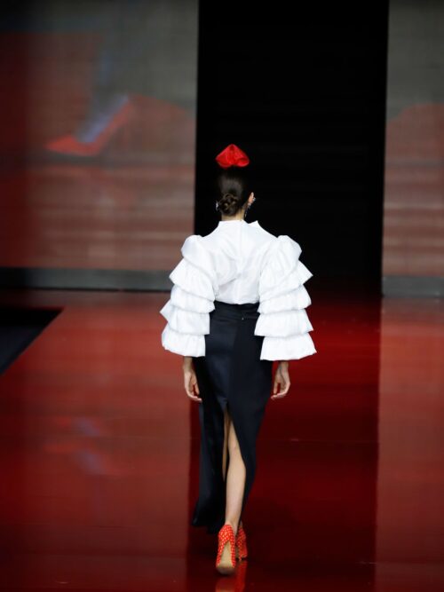 Camisa de seda con volantes en las mangas y escote con transparencia. Falda de tubo con abertura delante y detrás,