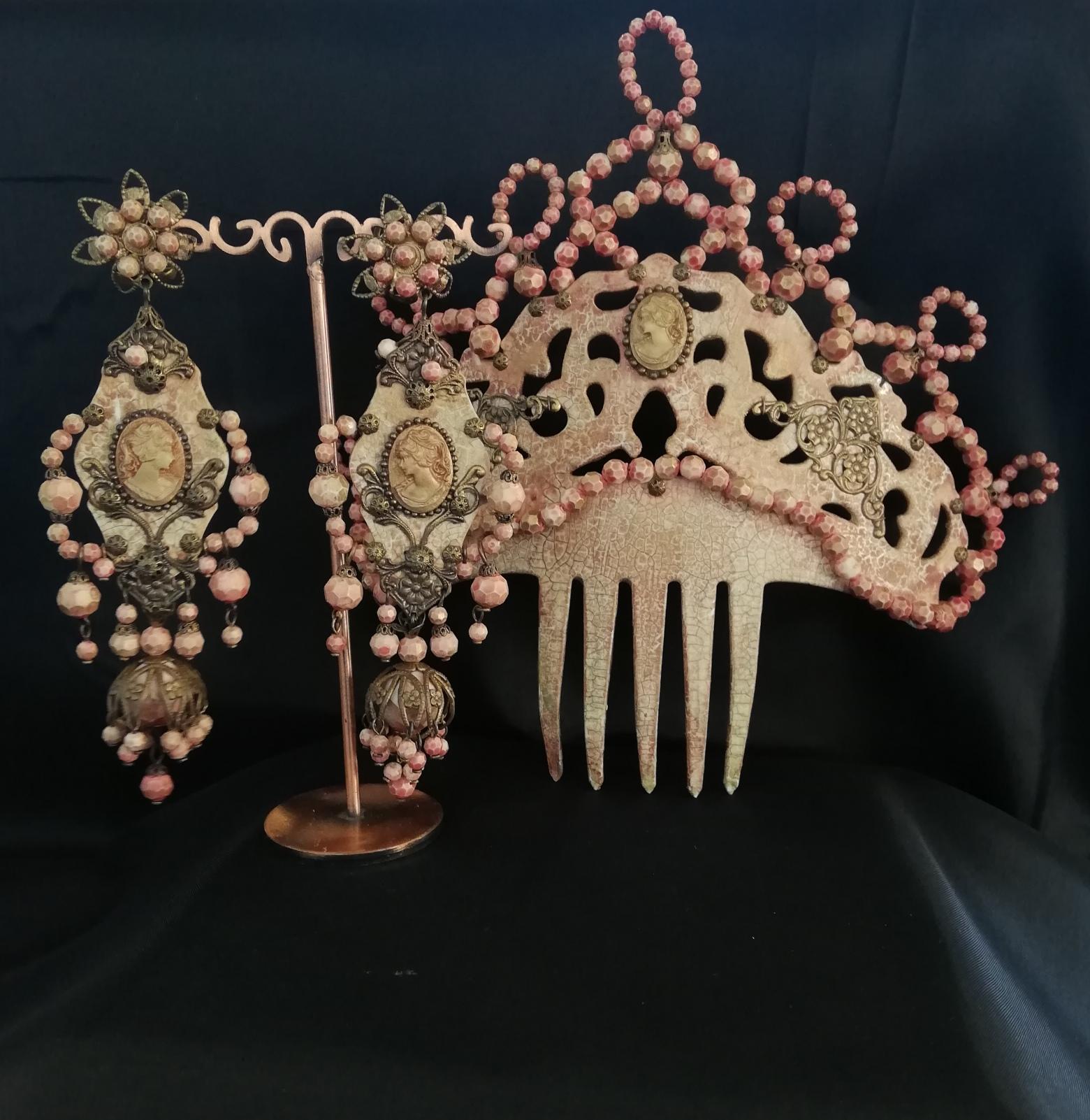 Conjunto de complementos de flamenca teñido a mano con camafeos en coral y nude.