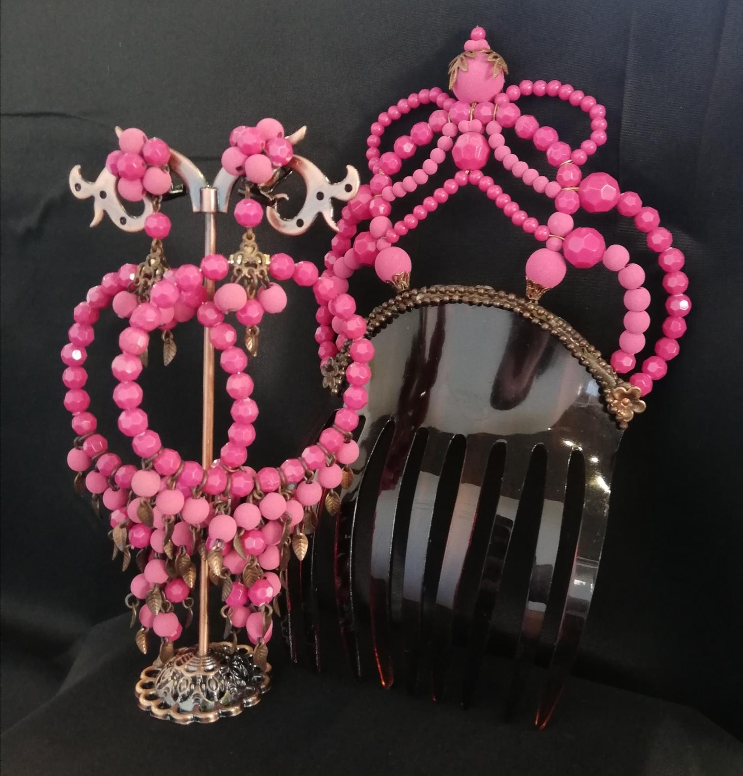 Conjunto de peineta y pendientes Dublos en fucsia y rosa claro.