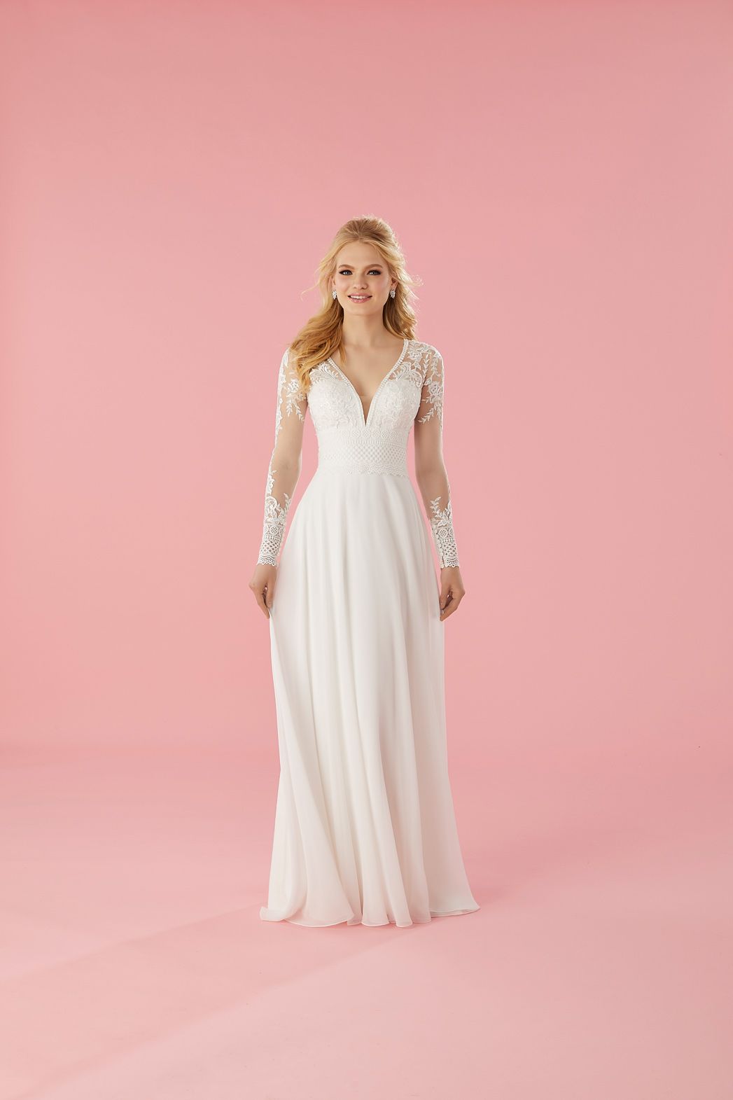 Vestido con cuerpo escarchado de bordado, cintura escalpada y escote en V, mangas largas y transparentes de tul Ivore con lentejuelas translucidas.