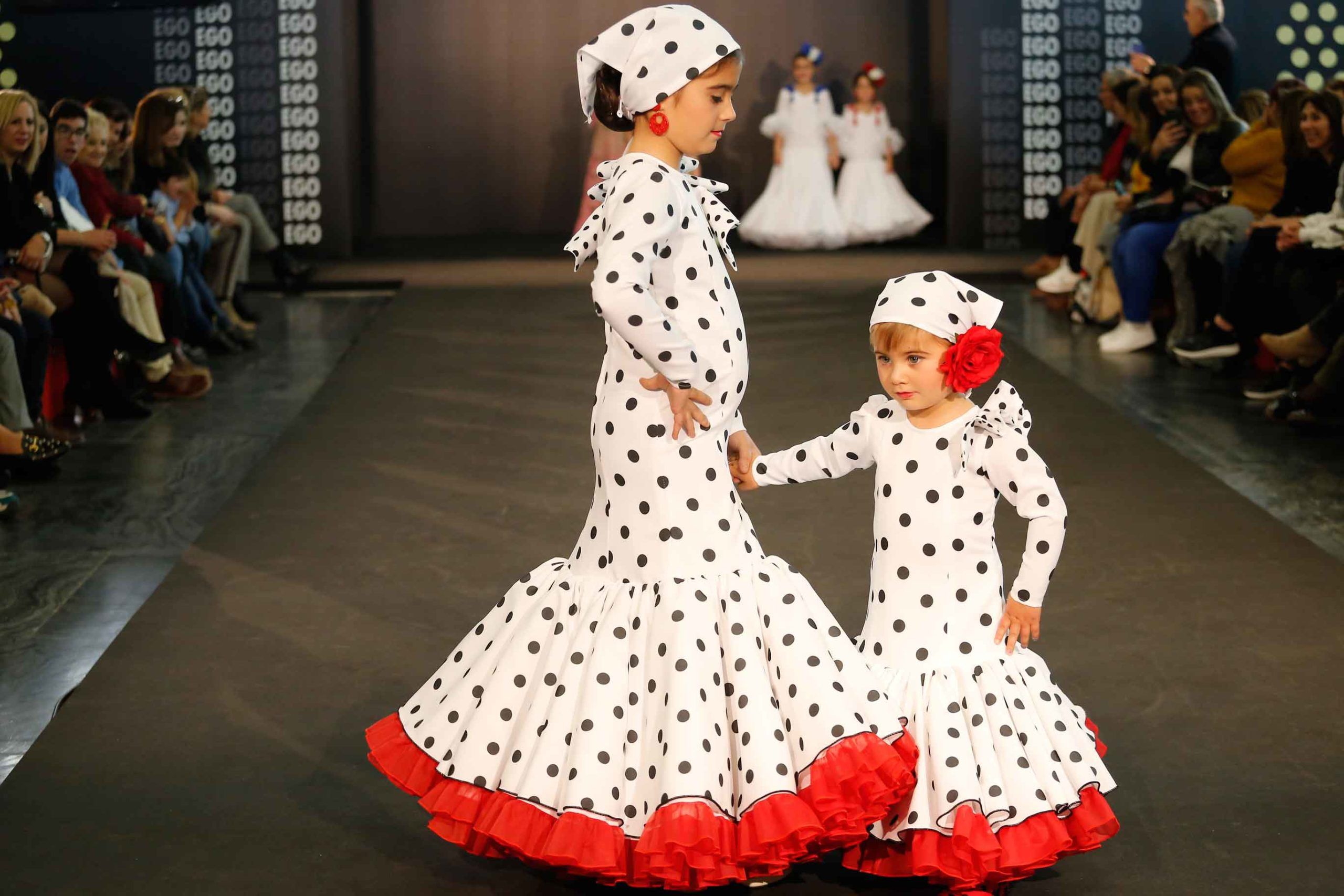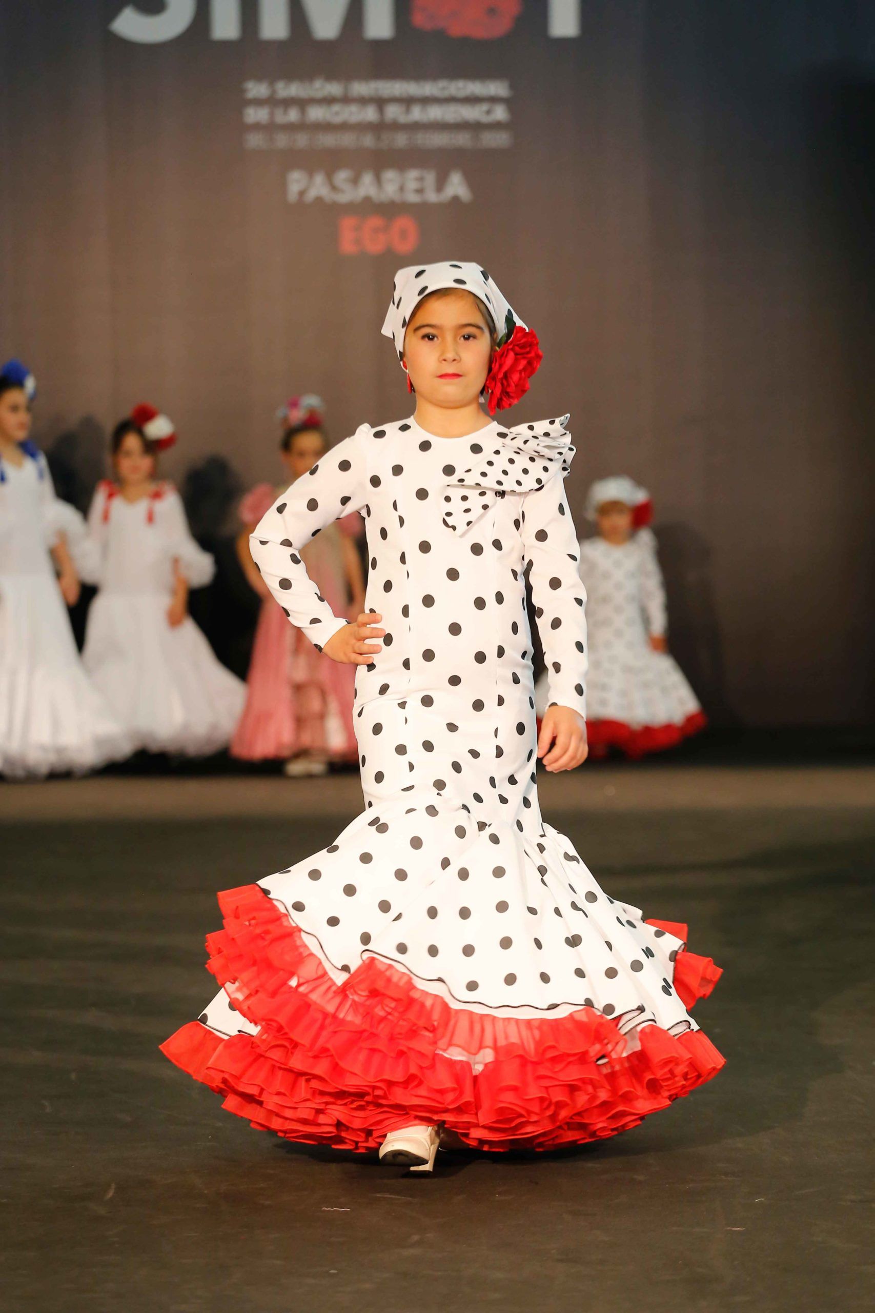 Vestido de flamenca infantil blanco con lunares negros y mangas largas sin volantes. Falda confeccionada con volantes de organdil. Pañuelo para la cabeza a conjunto con el vestido.
