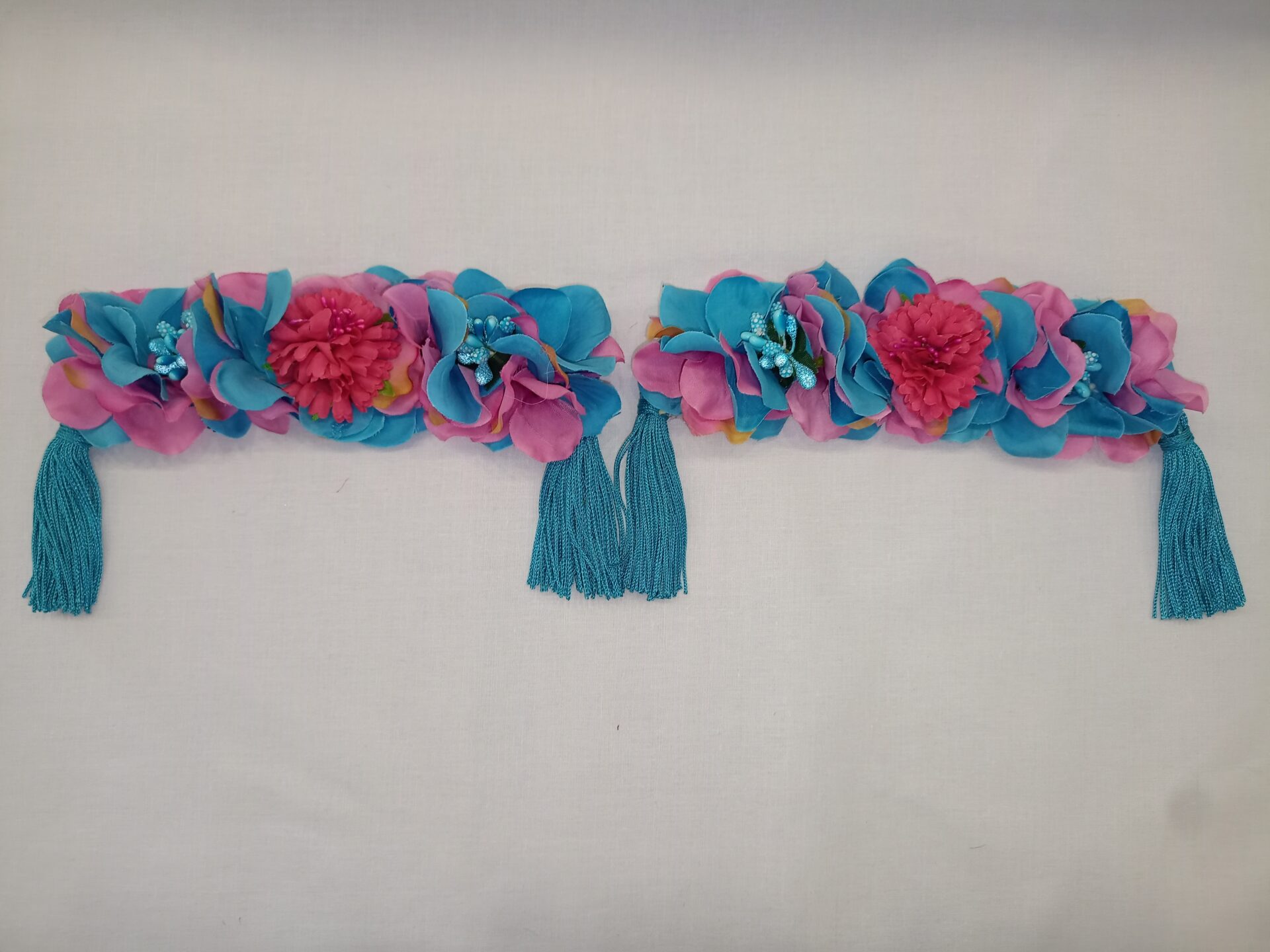 Hombrera de flamenca pequeña en tonos combinados rosas y celestes con una borla de flecos en cada extremo.