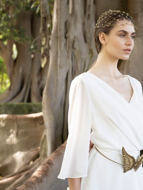 Traje pantalón en seda de geortte, blanco roto con camisa cruzada, con drapeado en el pecho y semicapa desde cintura a cadera, que hace que destaque mucho la cintura. Pantalon recto abierto, para darle movimiento y hace el efecto de falda.