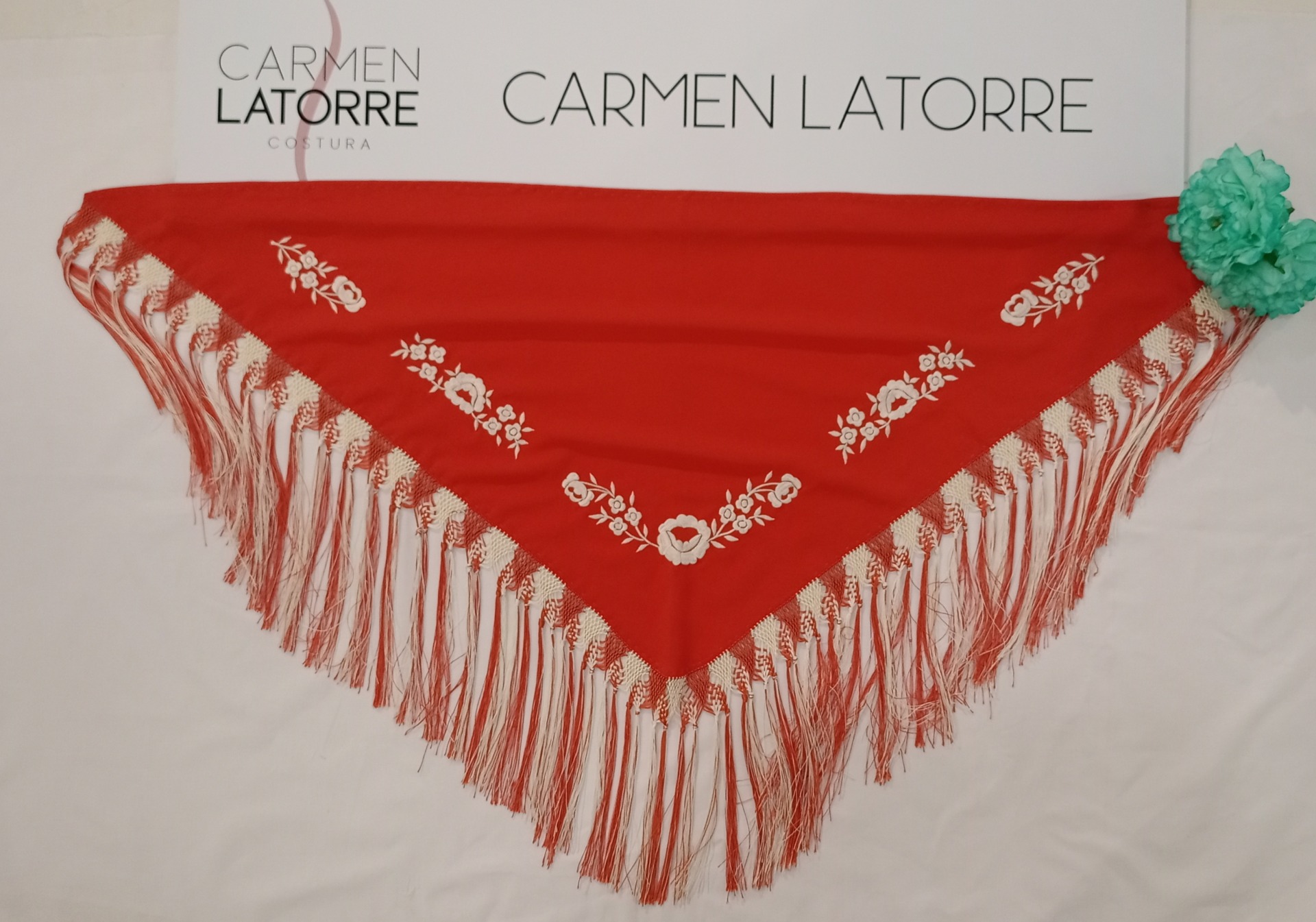 Mantoncillo de señora coral, modelo coral con bordados en blanco.