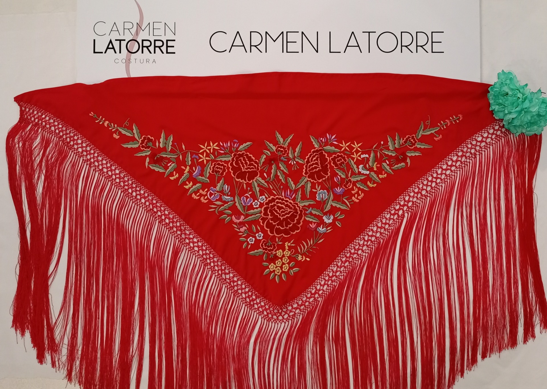 Mantoncillo de señora rojo, modelo Azo con bordados en tonos rojos y verdes.