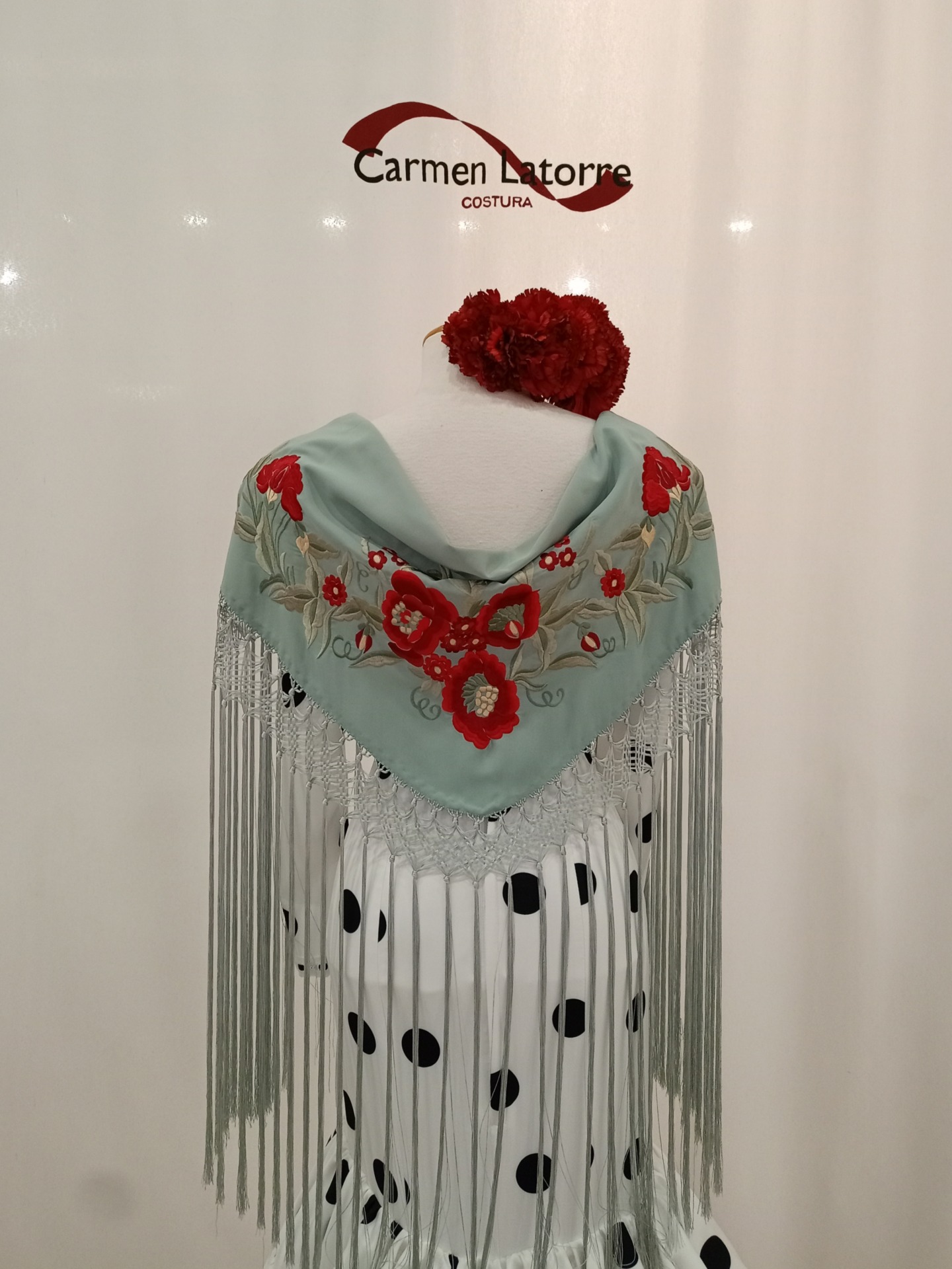Mantoncillo de señora verde seco, modelo Azo con bordados en tonos rojos y verdes.