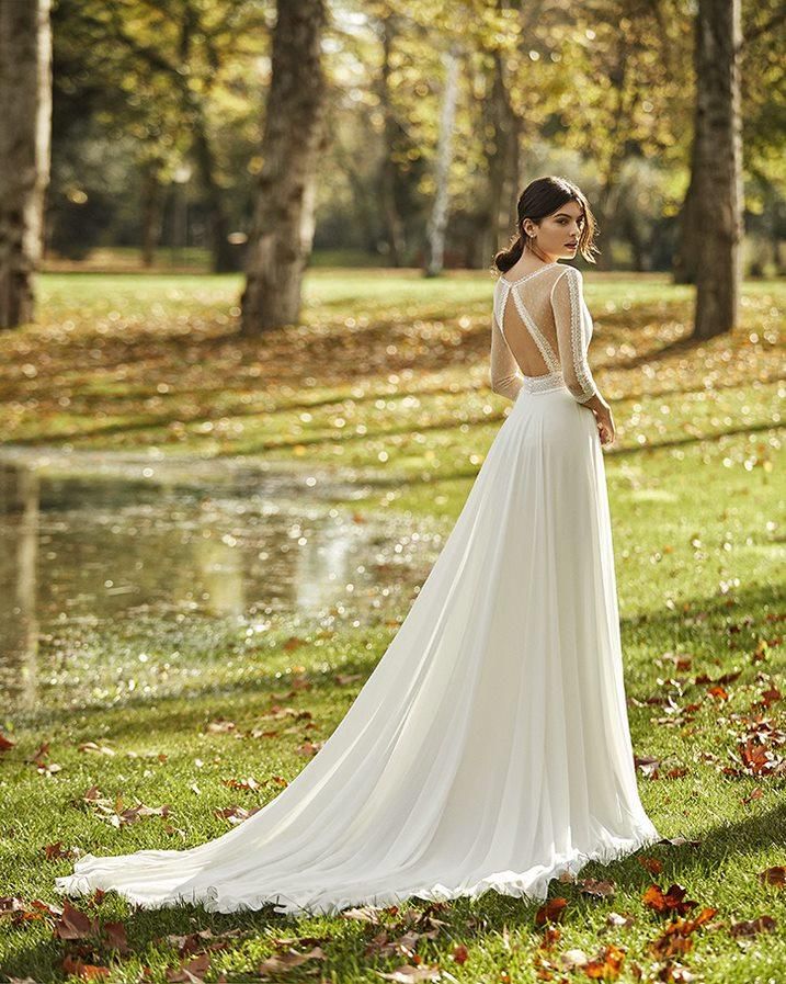 Vestido de novia con manga tres cuartos estrecha, cintura ceñida y falda de tul de plumeti muy vaporosa. Apliques de guipur en escote, talle y bocas mangas. Y transparencias de tul para darle más protagonismo a su escote y espalda en V. Conforman un vestido cargado de detalles para novias amantes del estilo ‘Princesa’.