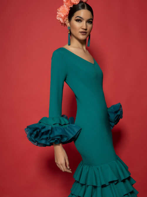 Vestido bioelástico con cinco volantes pequeños y uno grande con volumen y enaguas de clavel, manga estrecha con volumen de volantes y escote de pico
