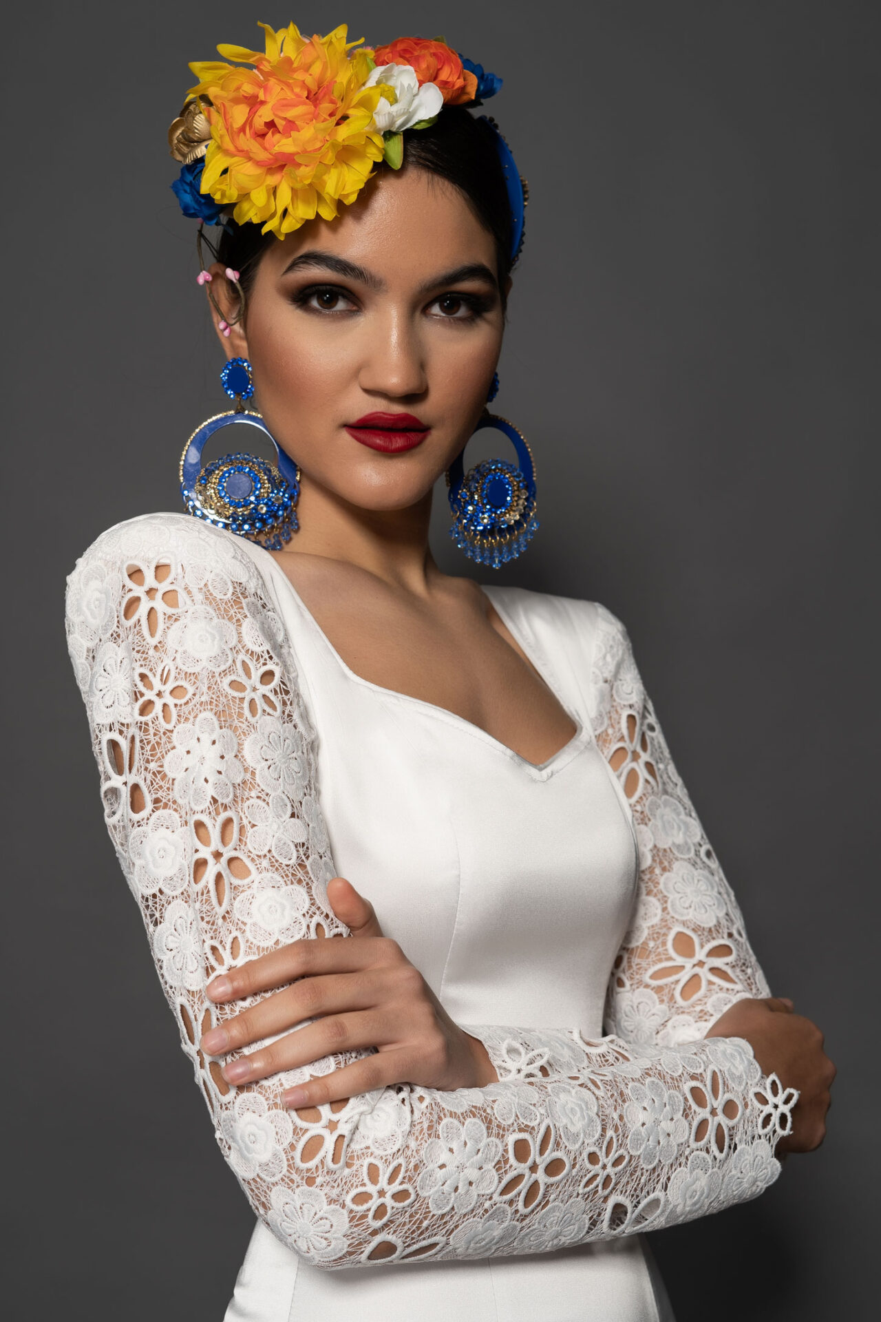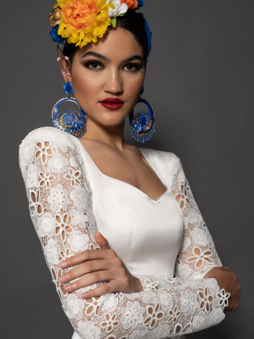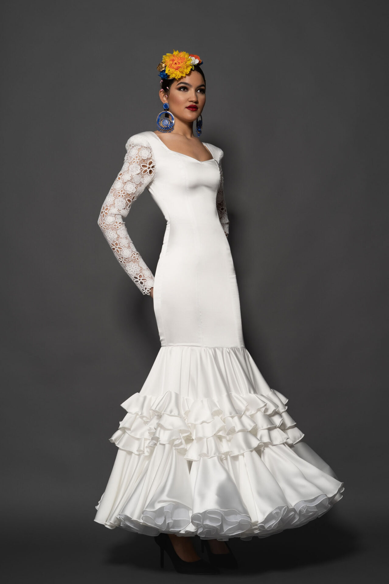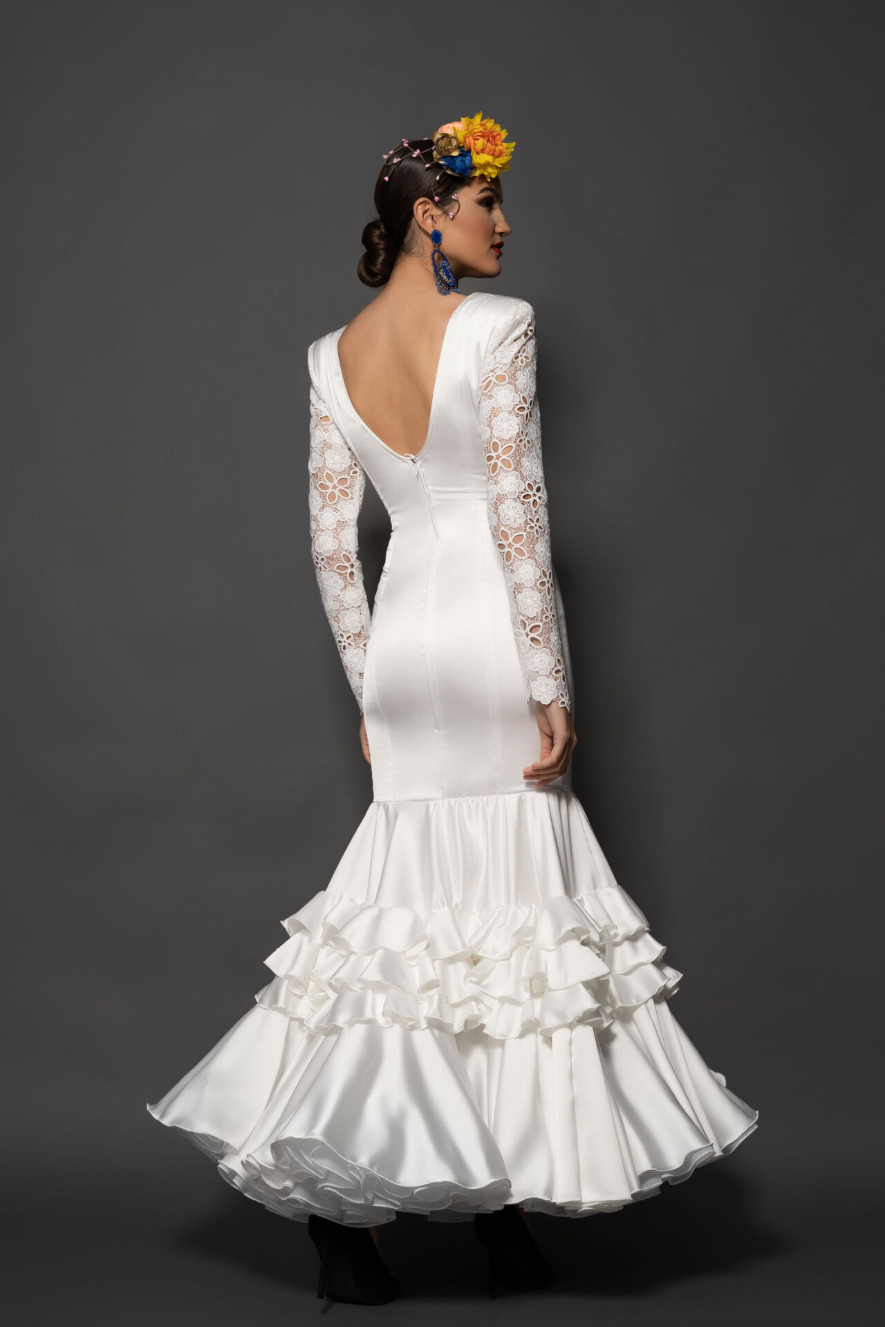 Vestido en satén de seda con mangas estrechas largas de guipur de seda, y falda de capa con tres volantes pequeños y uno grande, enagua de clavel