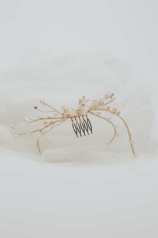 Tocado flexible con hilo dorado y semillas de ceramica blancas