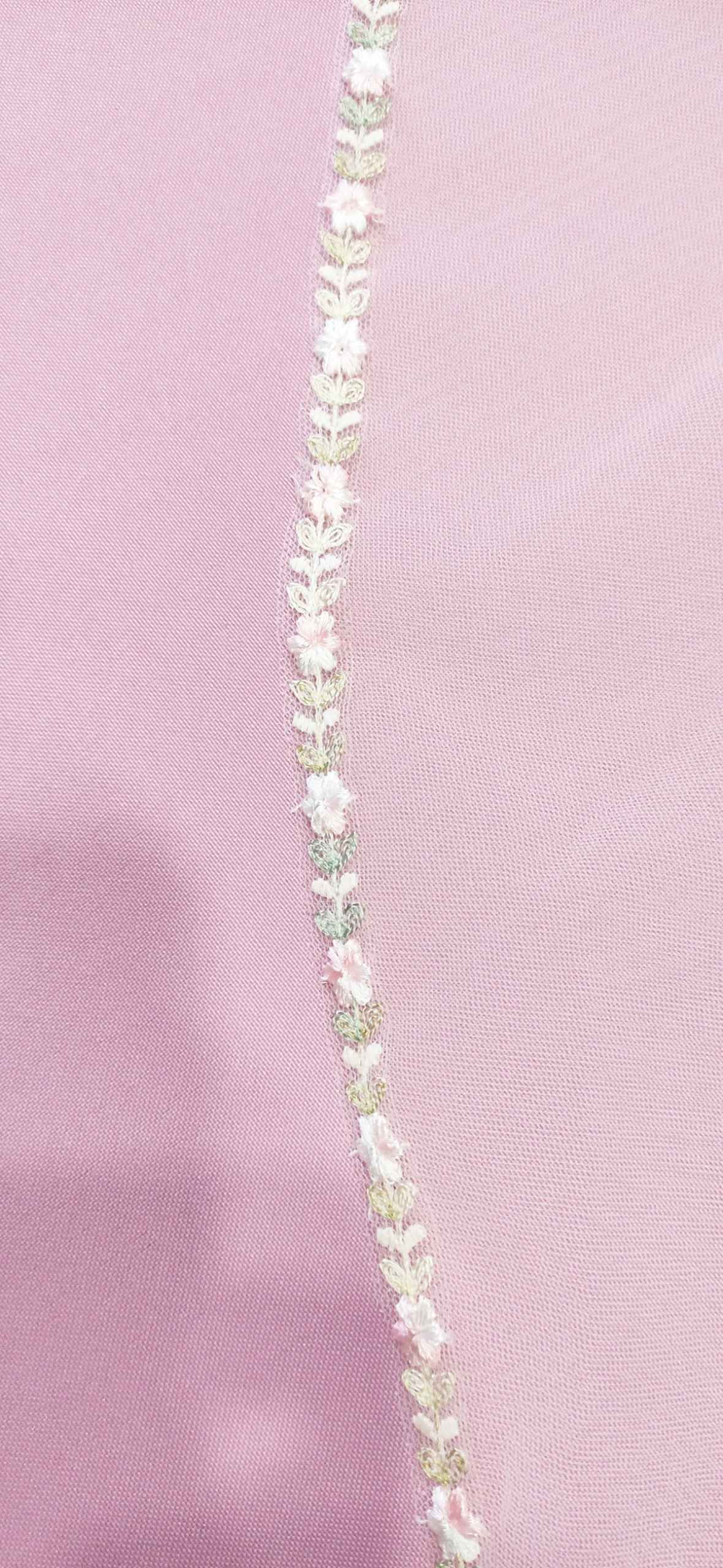 Velo mórbido con adorno de flores muy pequeñas en colores, blanco roto. Medidas: 2 x 3