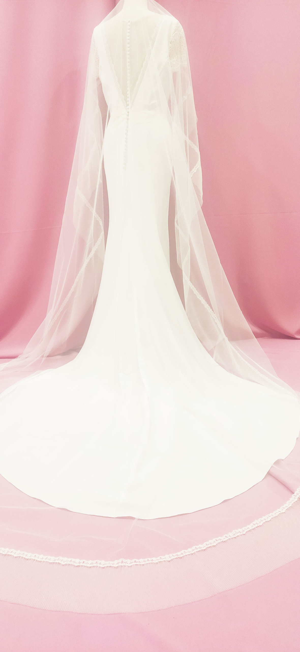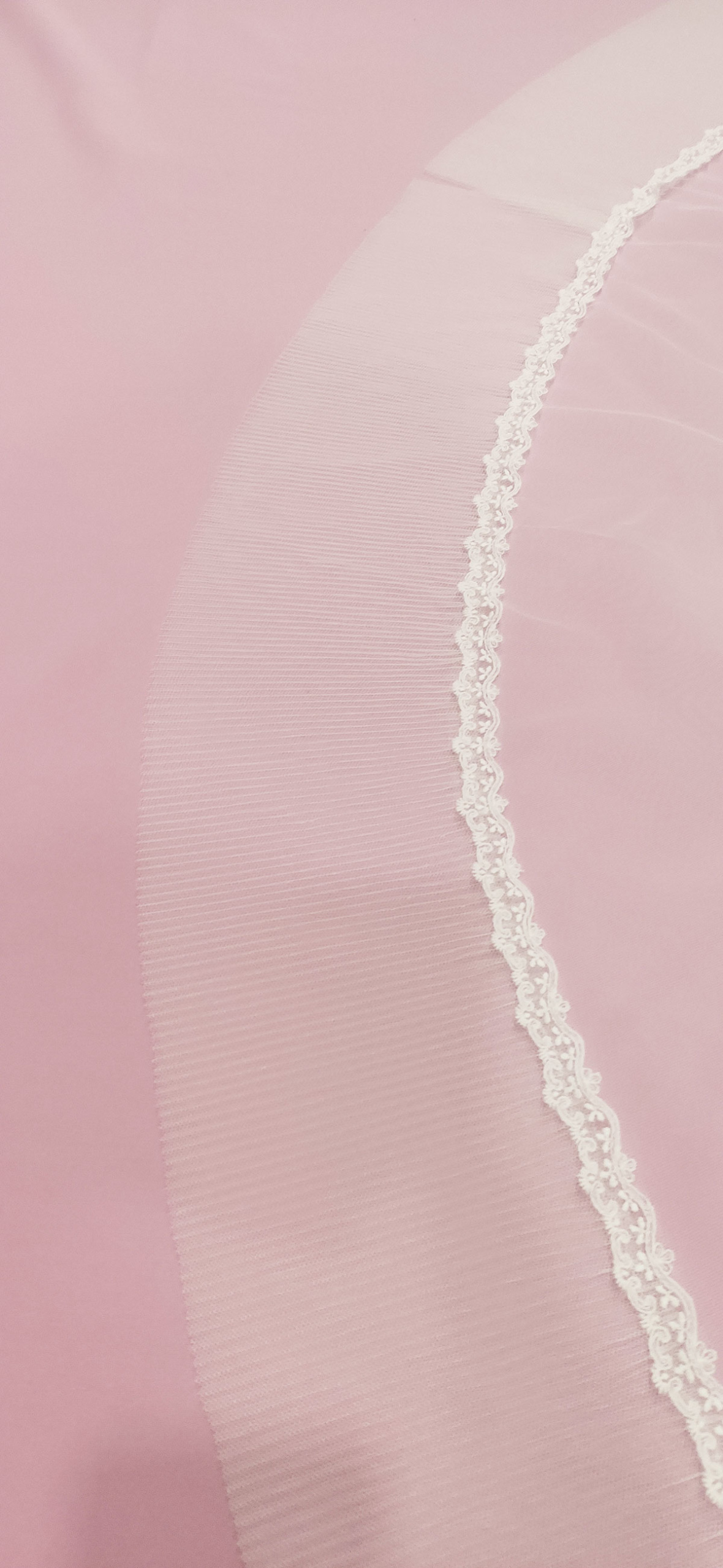 Velo de seda con volante plisado en el filo y puntilla de valencie, blanco roto