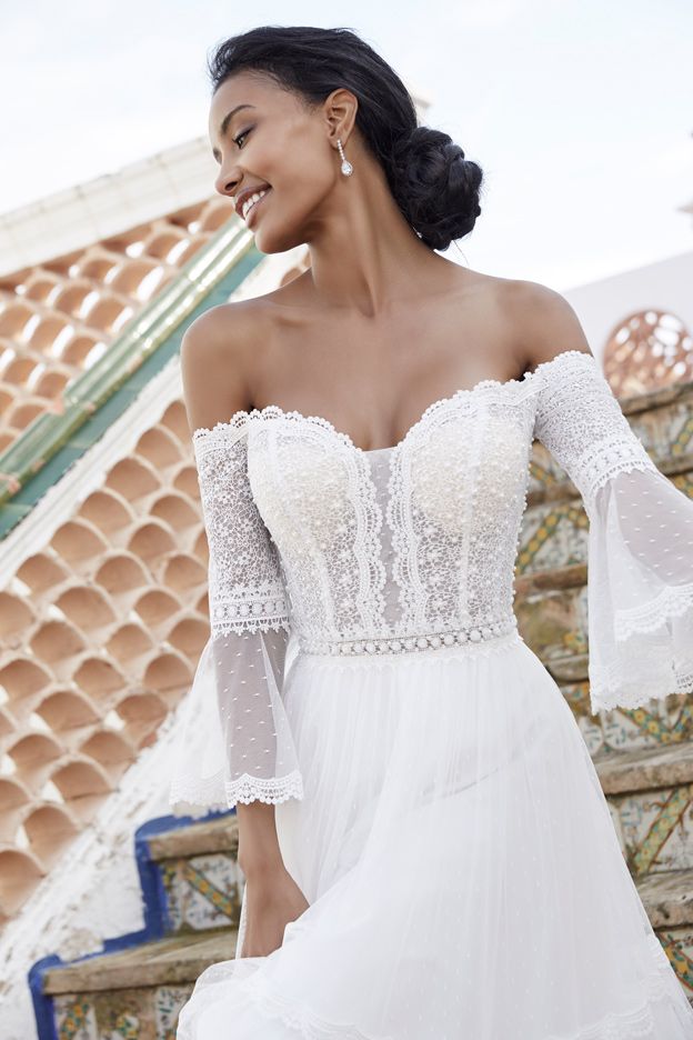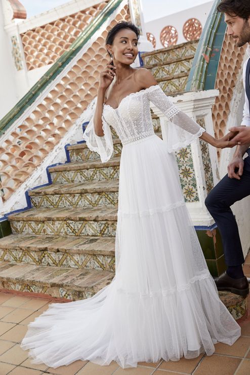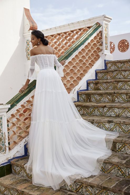 Este delicado vestido de novia con hombros descubiertos, inspiración boho, con plumety y detalle de encaje y mangas acampanadas de ¾ de largo.