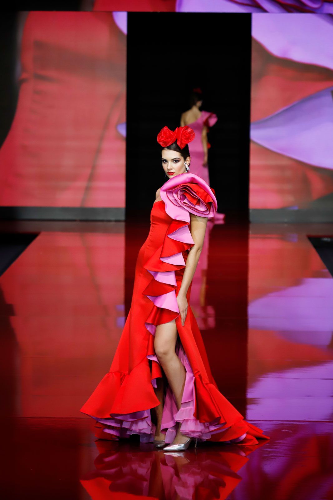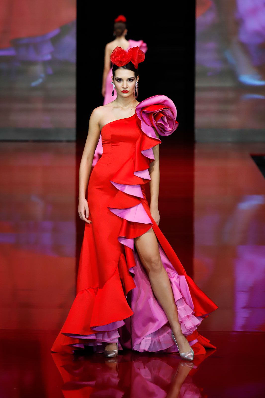 Vestido en mikado rojo con reversible en rosa frances, volante capote y abertura en el lateral con flor en el hombro.