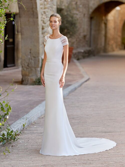 Vestido de novia de estilo Boho chic de corte recto, falda con abertura lateral; escote barco con espalda y mangas cerradas con tul de plumeti. Modelo Alma Novia confeccionado en crepé.