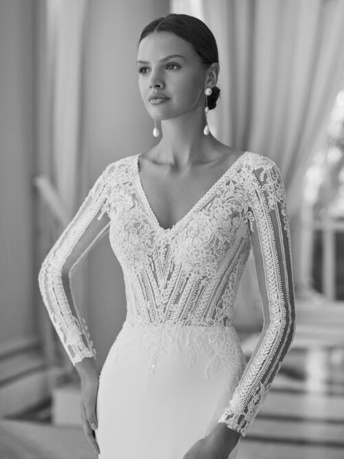 Vestido de novia de estilo romántico con corte recto y abertura lateral, cuerpo de guipur transparente con brillo, escote en V y espalda descubierta en forma romboidal, manga estrecha, larga y transparente del mismo guipur que el cuerpo. Modelo Aire Barcelona, elaborado en Crepé y guipur con forro moldeador.