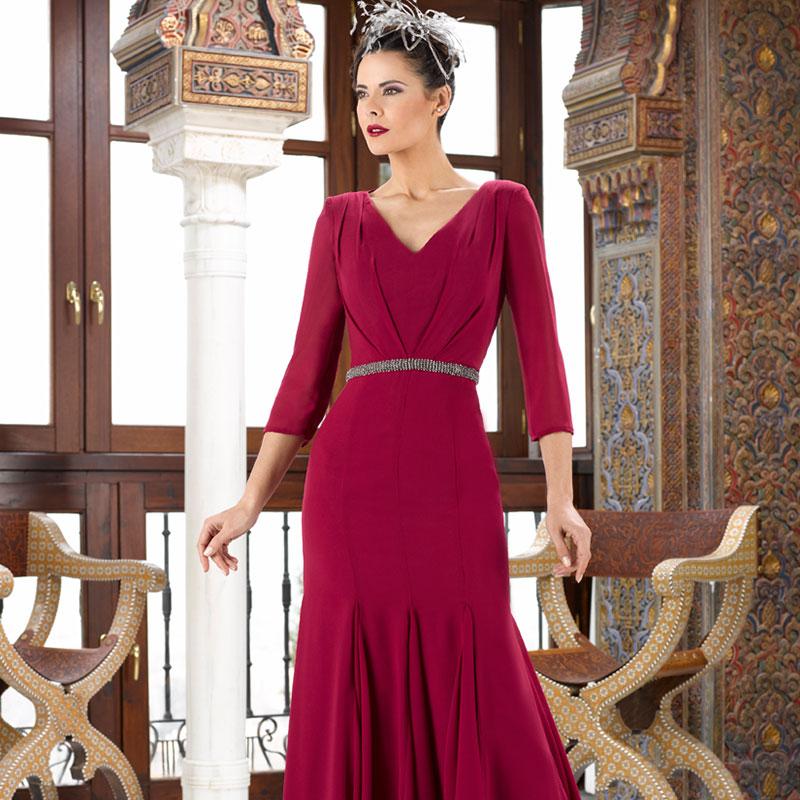 Vestido gasa burdeos con drapeado en el pecho y godets en la falda