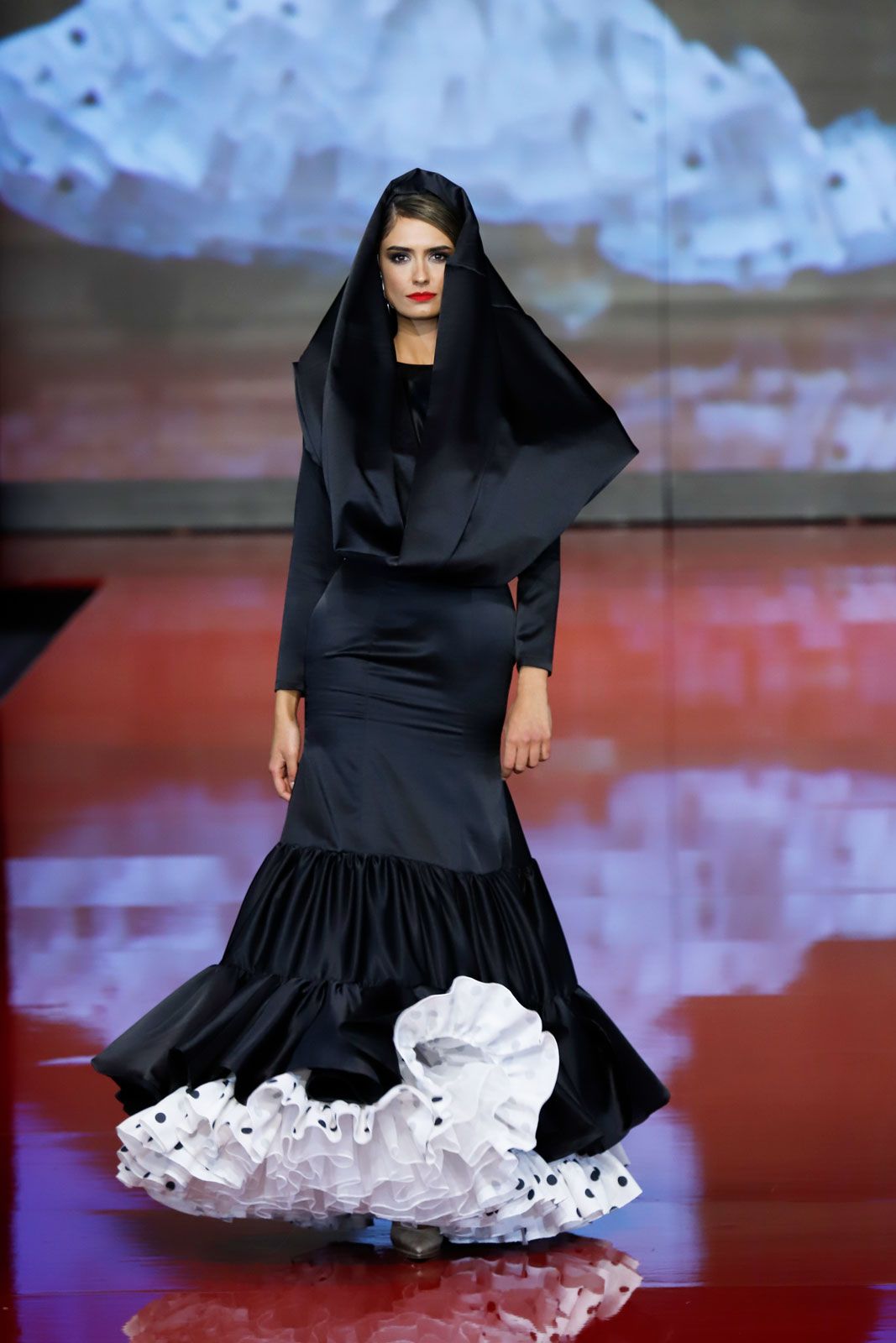 Crec de satén negro con capelina con volumen en bajos de lunares negros