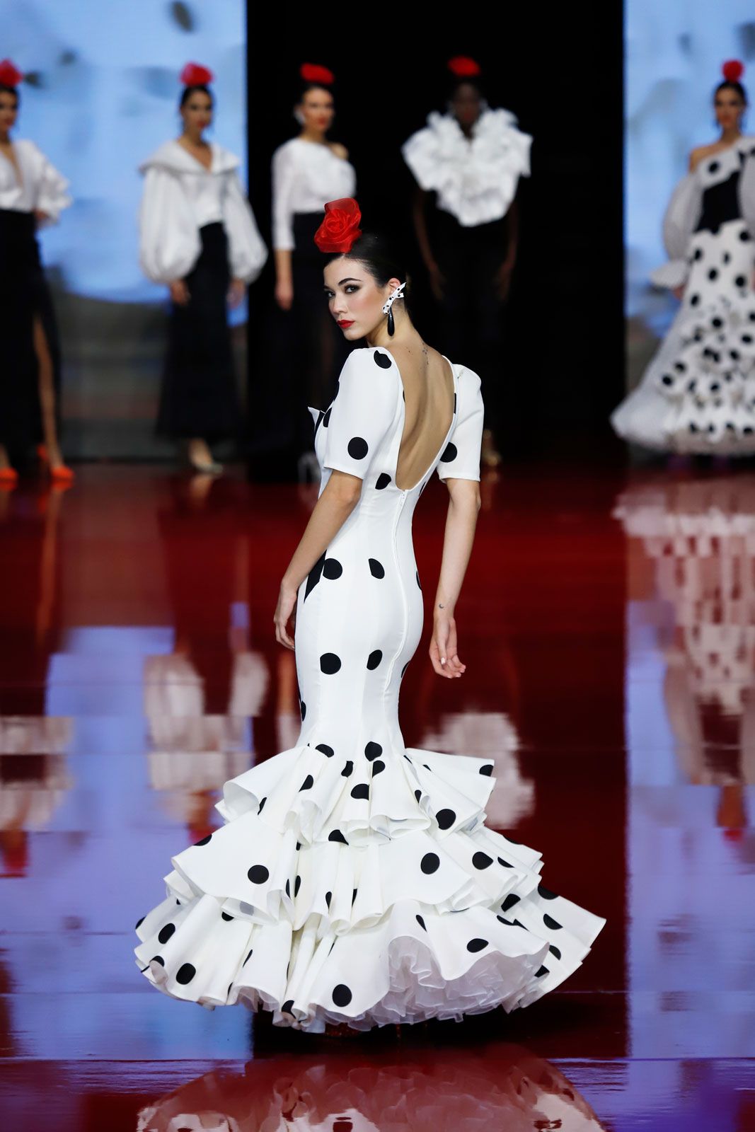 Vestido en crec de licra blanco con lunar galleta negro y centro de rayas, laborioso trabajo de patronaje en sus corte y volantes forrado sin dejar costuras a la vista. Manga estrecha corta y forma de pecho en rayas.