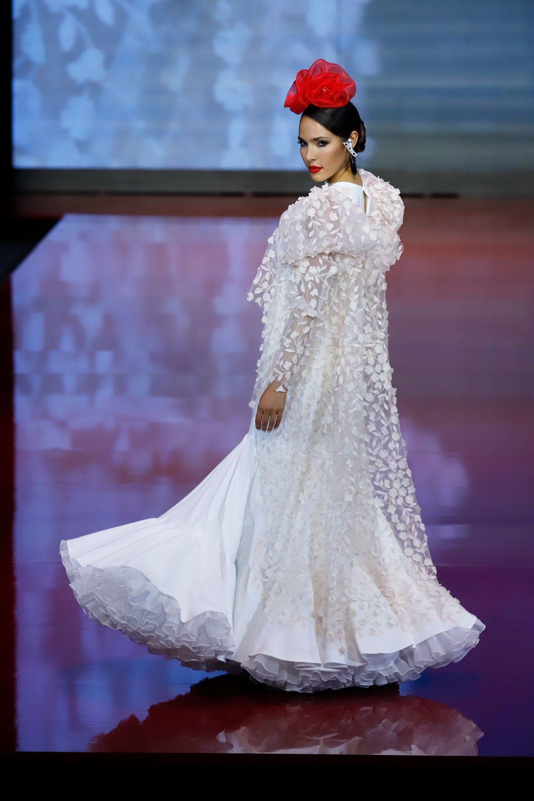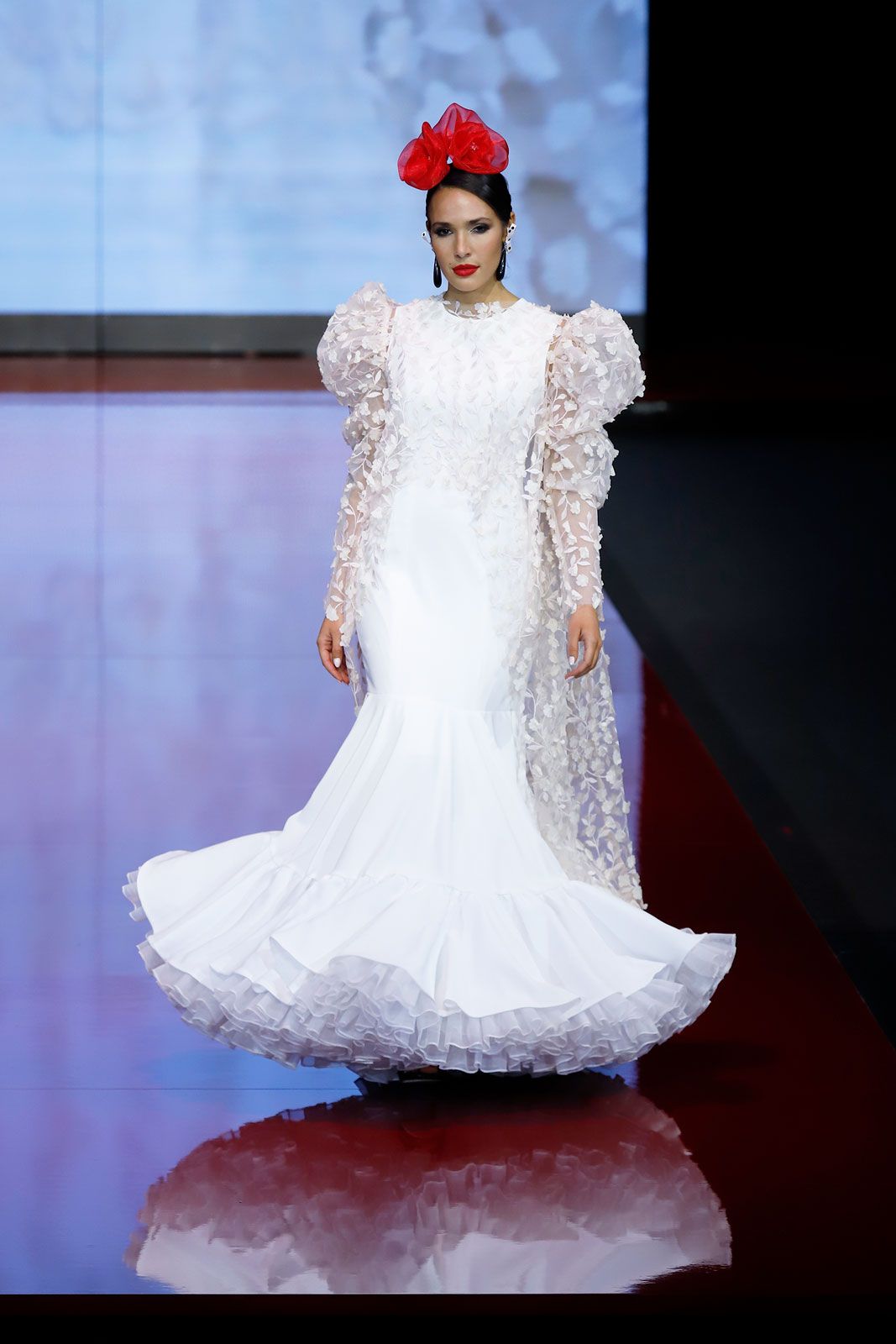 Vestido en crec de licra blanco con volante maxi forrado con sobreblusa de flores en rosa nude y mangas de volumen precio